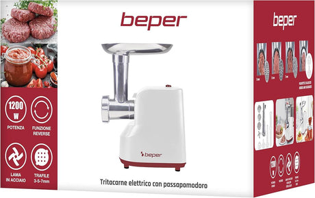 Beper Elektrischer Fleischwolf & Tomatenpresse P102ROB200, 1200 W, mit 3 Edelstahl-Matrizen