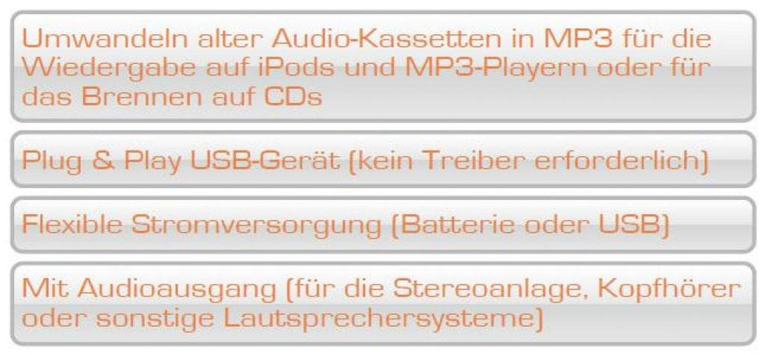- Umwandeln alter Audio-Kassetten in MP3 für die Wiedergabe auf PC´s, iPods/MP3-Playern oder das Brennen auf CDs