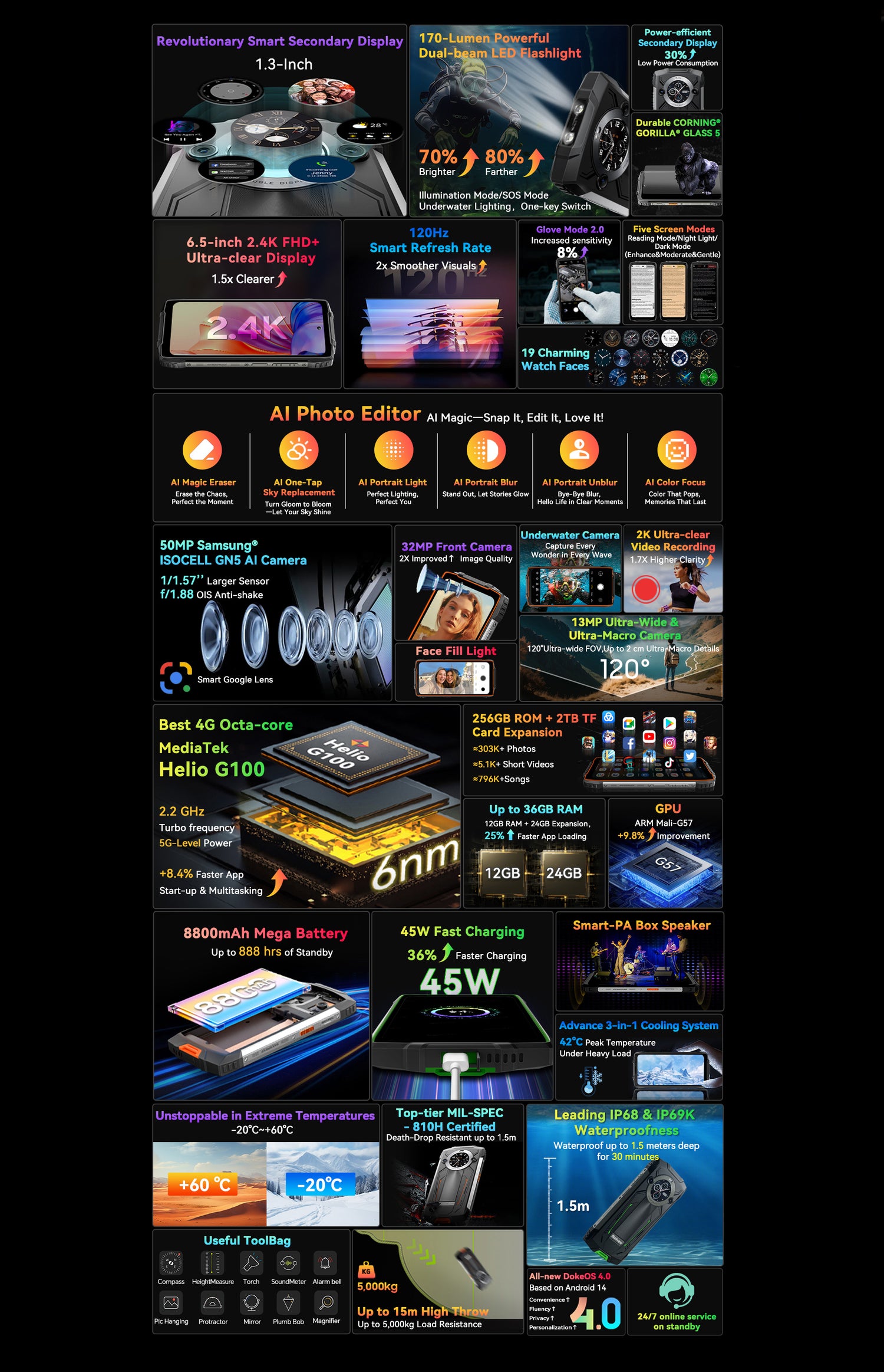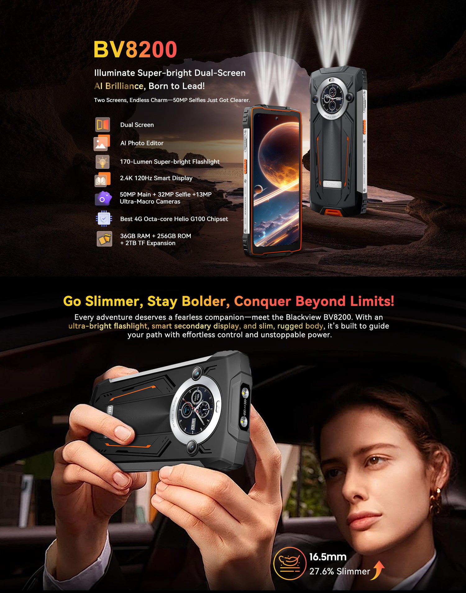 Blackview BV8200 Outdoor-Smartphone, 170-Lumen-Taschenlampe, Dual-Display, Helio G100, 36+256GB, 6,5" 120Hz FHD+, 50MP, IP68, Android 14, NFC