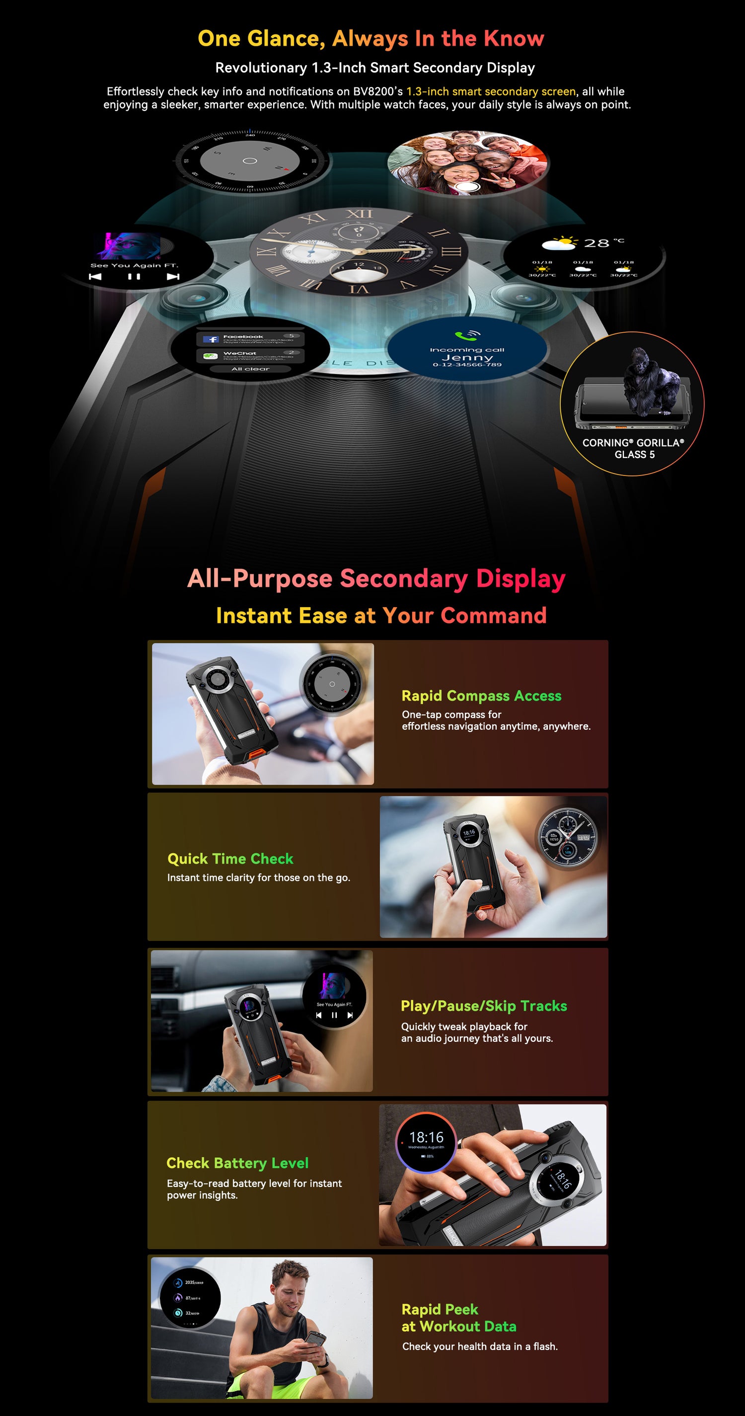 - Dual-Display: 6,5" Hauptscreen + 1,3" Zusatzdisplay