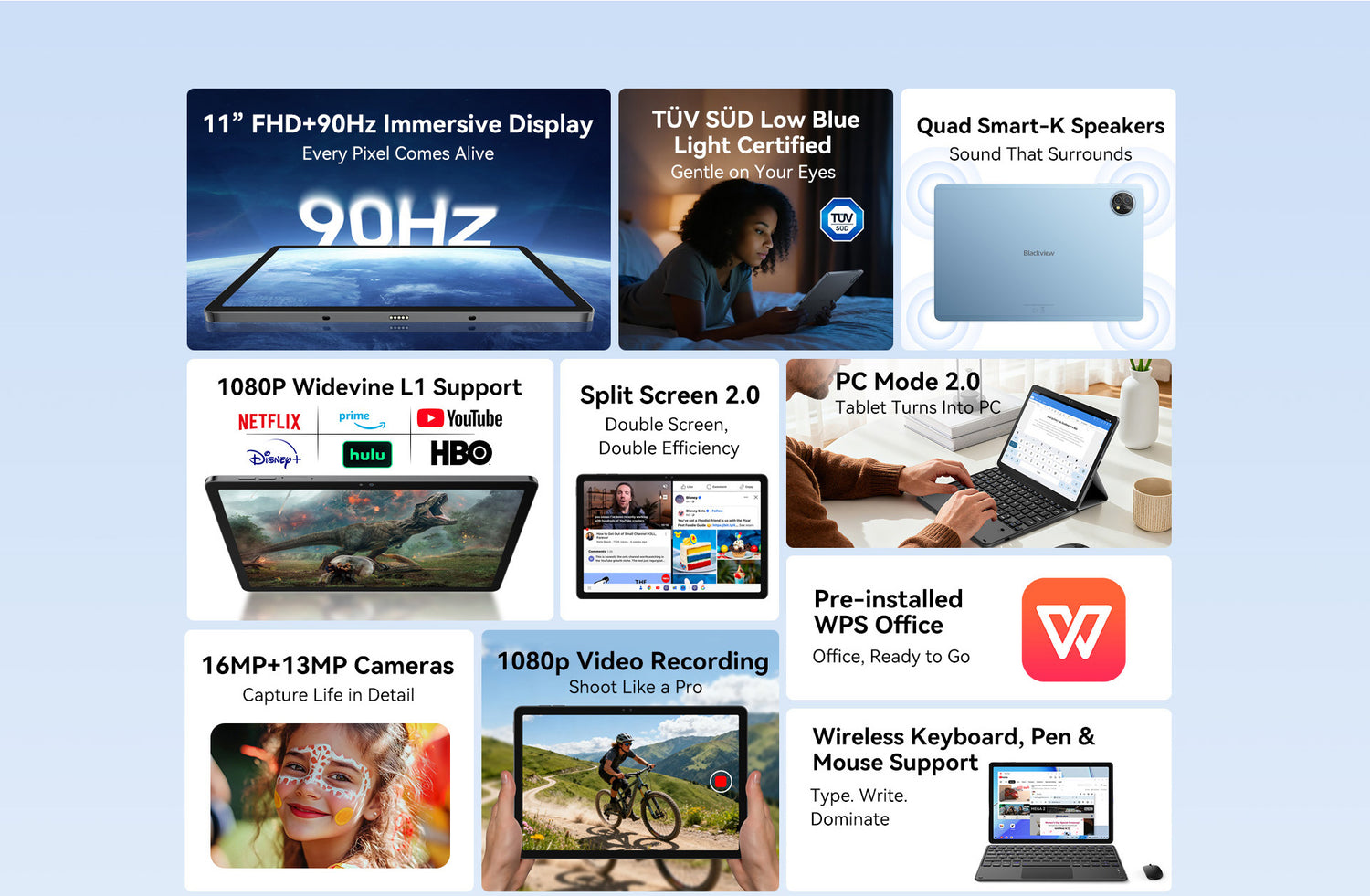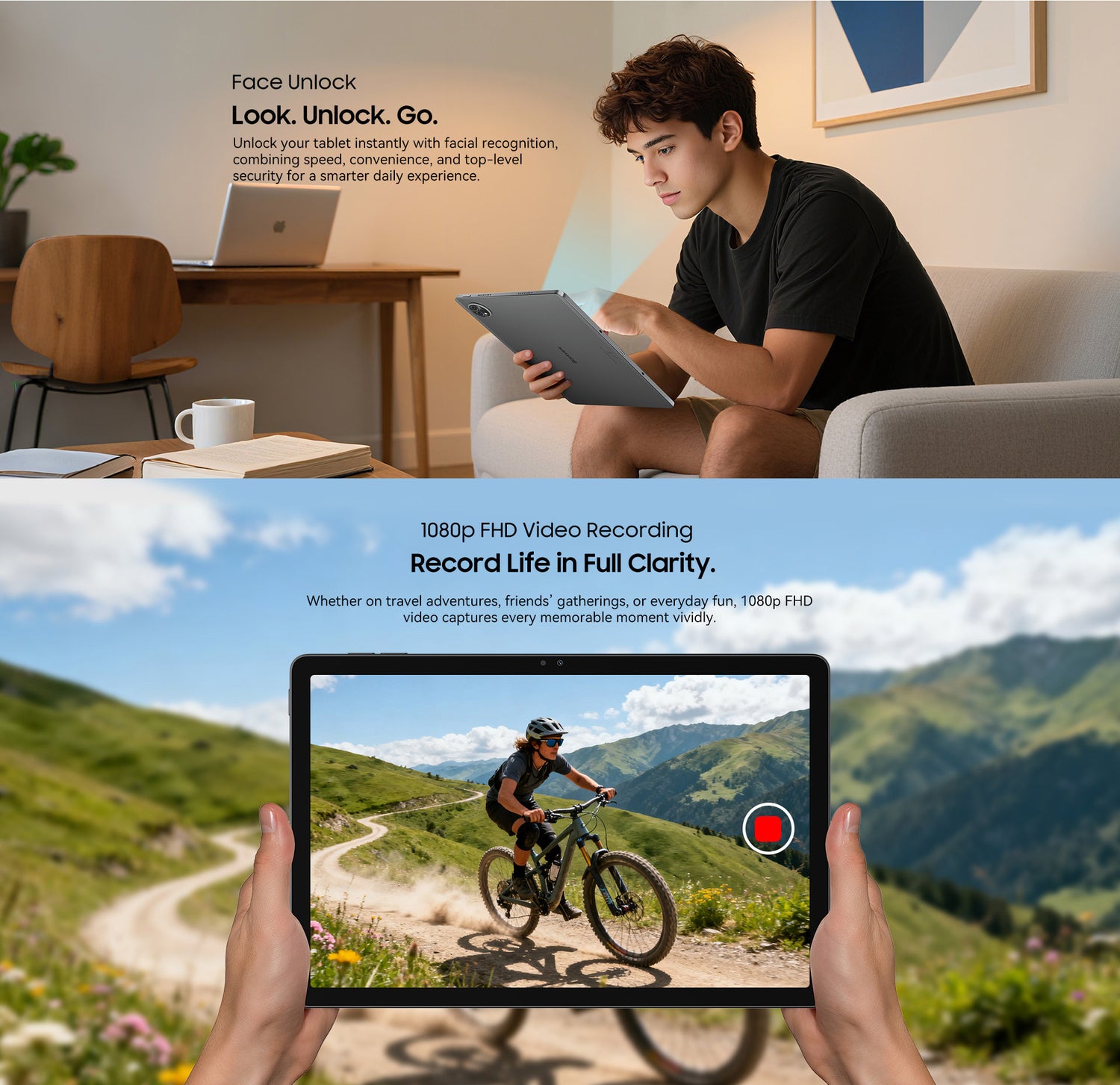 Das 11-Zoll-FHD+ 90Hz Display bietet kristallklare Bilder, während vier Lautsprecher einen immersiven Sound liefern. Die Dual-Kamera (16MP+13MP) und 1080p Videoaufnahme halten jeden Moment lebendig fest.