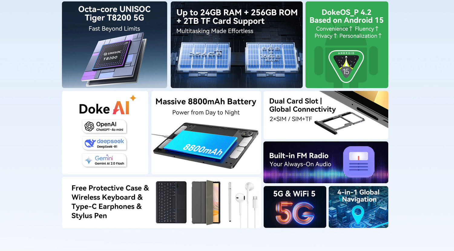 8800 mAh Akku mit 18 W Schnellladung sorgt für stundenlange Nutzung. DokeOS_P 4.2 auf Android 15 bietet flüssige Bedienung und nahtloses Multitasking.