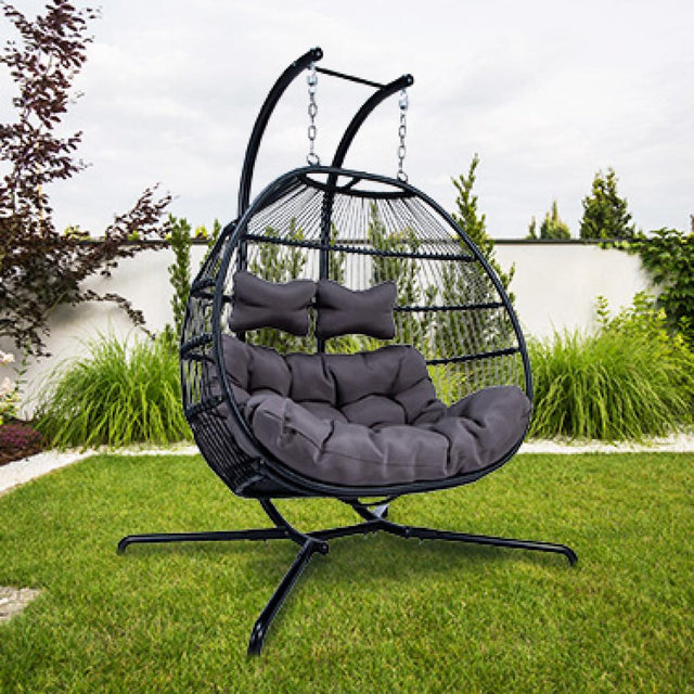 PureHaven Hängesessel für 2 Personen 130x120x200 cm Rattan-Kunststoffgeflecht mit Kissen wasserfest strapazierfähig gefederte Aufhängung grau/schwarz