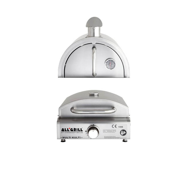 Multi-Kulti Gasgrill mit Pizzabackhaube aus Edelstahl, Temperaturen bis 350°C, Abmessung 42 x 51 x 25 cm, Brenner 3,8kW mit Zündsicherung ist auf Lager und wird versandt, sobald es wieder verfügbar ist