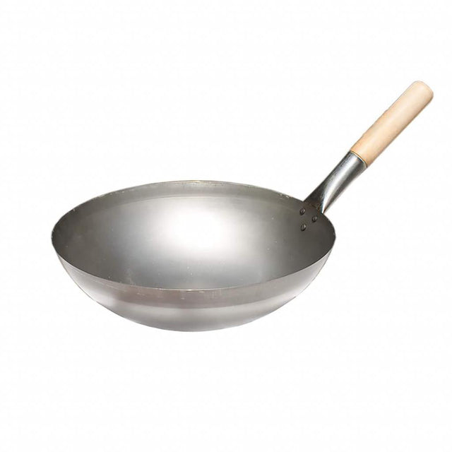 Original chinesischer Wok Ø 35 cm aus Stahl ohne Beschichtung, stabiler Holzgriff, runder Boden