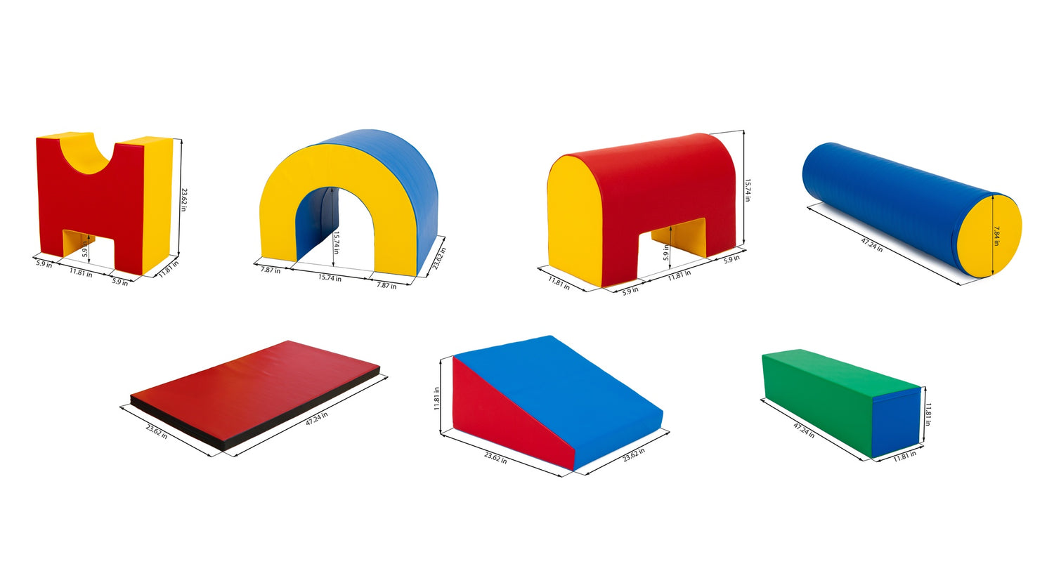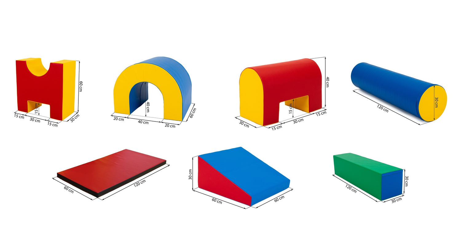 - 12 verschiedene XL-förmige Schaumstoff-Module in mehreren Farben und geometrischen Formen (u. a. Treppen- und Rutschkombinationen)