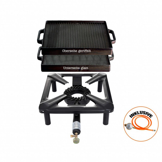 Hockerkocher mit Gussgrillplatte 32x32 cm - Komplettpaket für Camping und Profiköche - 30x30 cm, 4 kW, ohne Zündsicherung