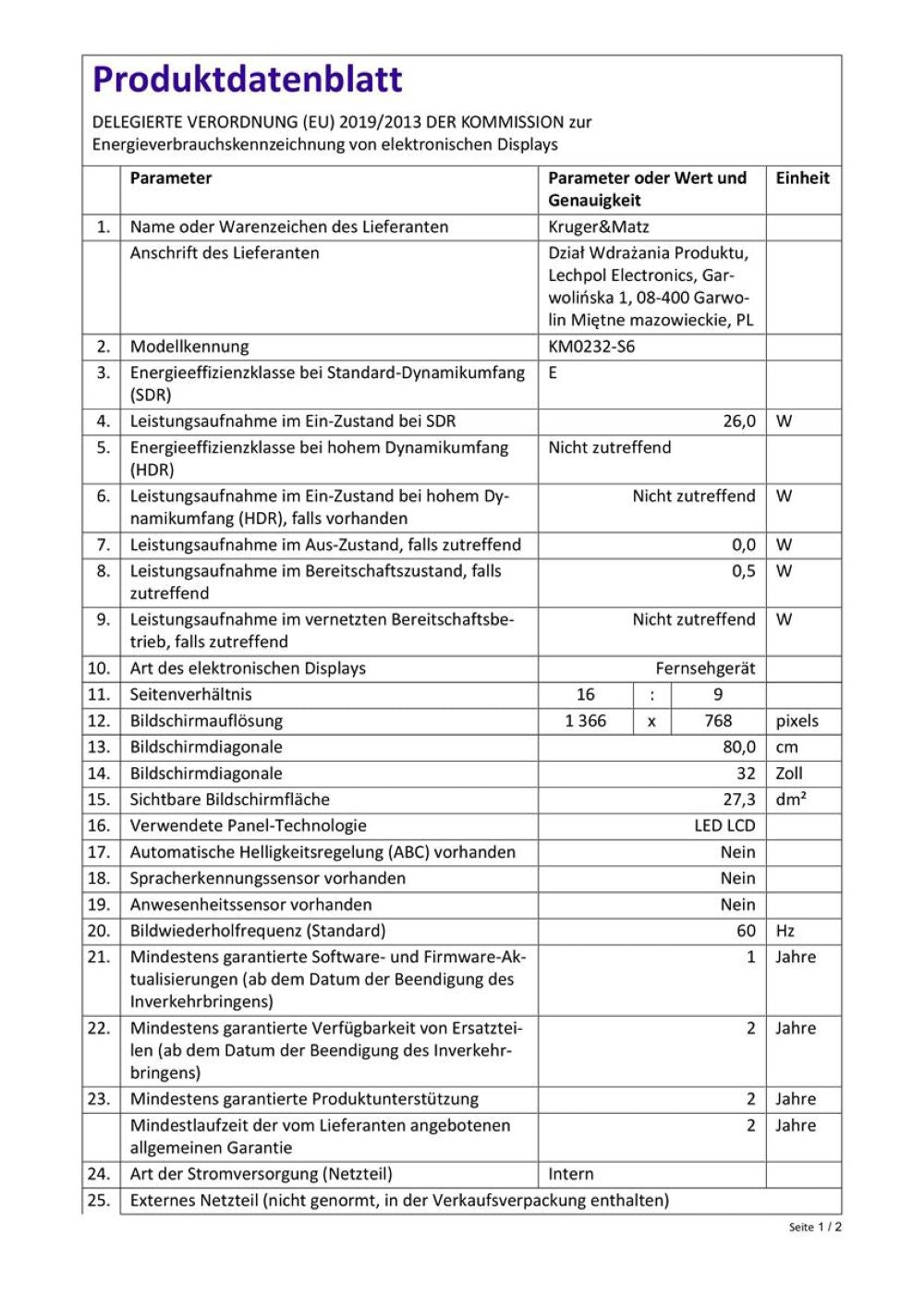 Krüger & Matz KM0232-S6 32 Zoll HD-ready WLAN Smart TV DVB-T2/S/C USB EEK: E