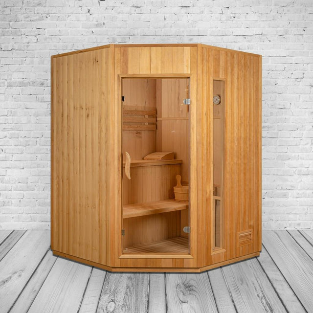 PureHaven Finnische Sauna 150x150x200 cm Harvia Saunaofen für 3 Personen Hemlockholz komplettes Zubehör Saunasteine Glastür Thermometer Beleuchtung
