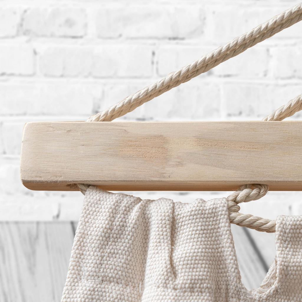Komfort durch reine BaumwolleDie Liegefläche der Hängematte besteht aus reiner Baumwolle und bietet somit hohen Komfort beim Entspannen. Die helle Farbgebung des Webstoffs ergänzt die Nuance des Holzes perfekt und sorgt für ein harmonisches Gesamtbild in Ihrem Außenbereich.